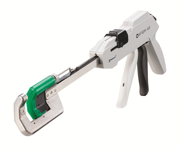 一次性使用切割吻合器及切割組件提供左右各兩排交錯(cuò)的鈦釘,可同時(shí)閉合并切割兩組鈦釘之間的組織。